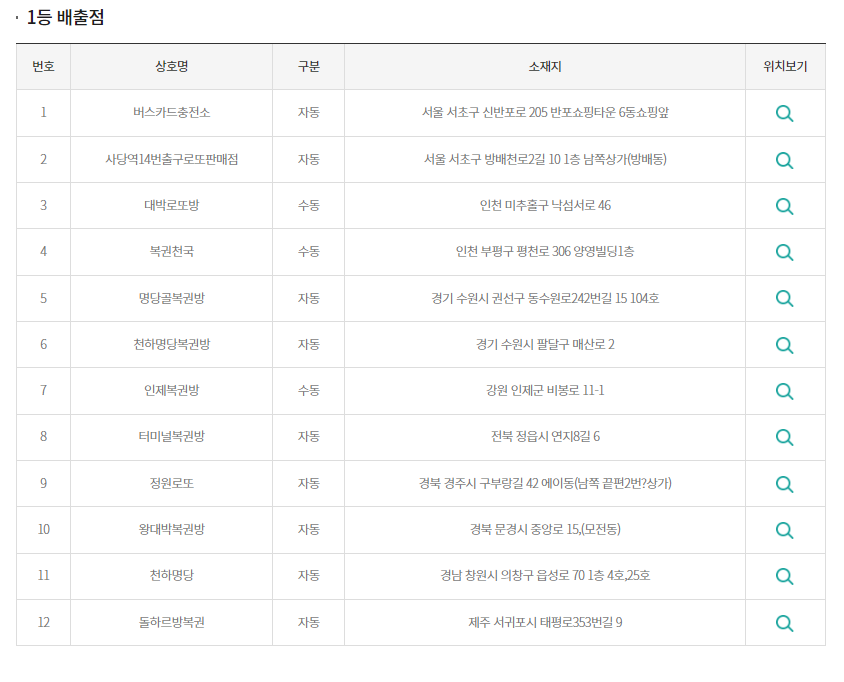 다음은 1072회 로또가 당첨된 판매점입니다.