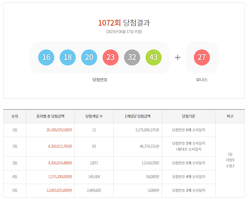 이번에는 1072회 로또 당첨 결과로 로또 추첨 결과 16,18,20,23,32,43이 1등이 되었습니다.