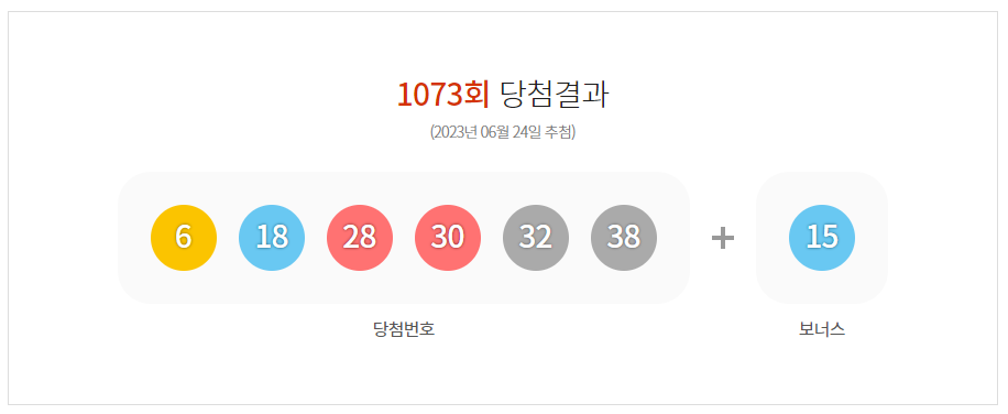이번에는 1073회 로또 당첨 결과로 로또 추첨 결과 6,18,28,30,32,38이 1등이 되었습니다.