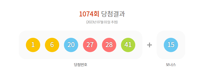 1074회 당첨 번호는 1,6,20,27,28,41 + 15 였습니다.