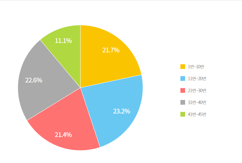 기존의 데이터에 기반하여 분석해본 결과 20~40의 짝수 번호가 다음 회차에서 많이 나올 것이라 예상됩니다.