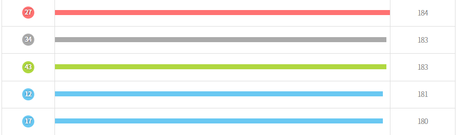 숫자 27,34,43,12,17의 경우 지금까지 가장 많이 나왔던 번호 입니다.