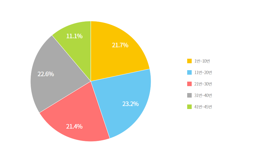 가장 최근의 5회의 로또의 경우 짝수의 비중이 훨씬 높음을 알 수 있습니다.