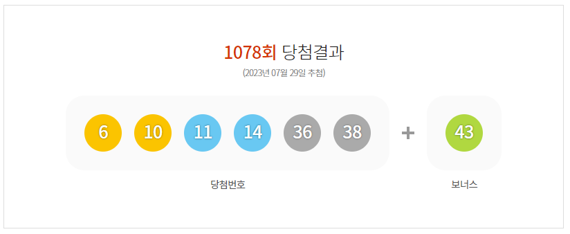이번에는 1078회 로또 당첨 결과로 로또 추첨 결과 6,10,11,14,36,38,43이 1등이 되었습니다.