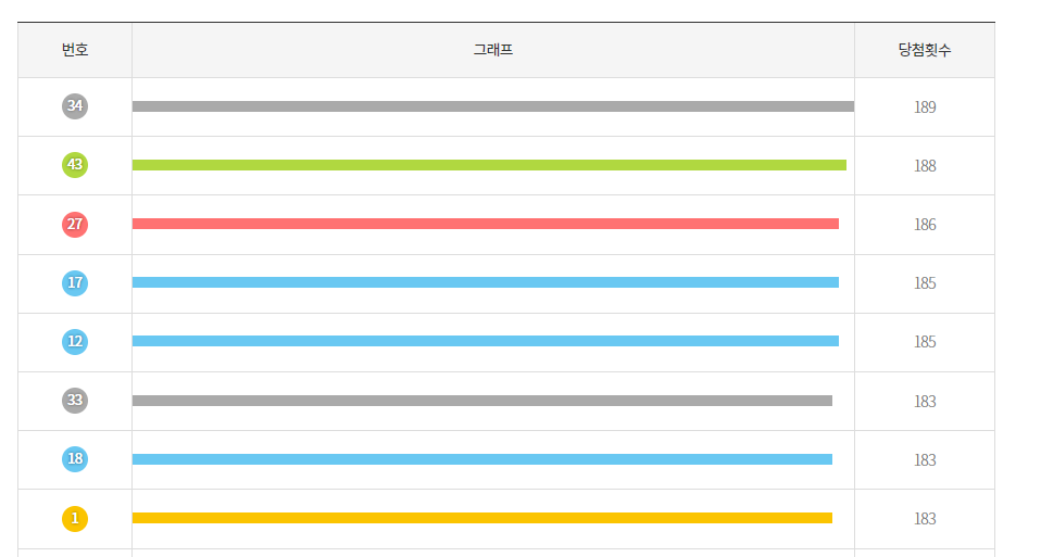 숫자 34,43,27,17,12,33,18 의 경우 지금까지 가장 많이 나왔던 번호 입니다.