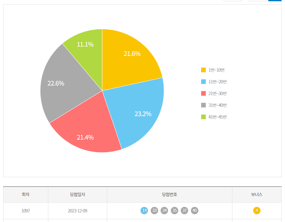 1097회 당첨 번호는 14,33,34,35,37,40 + 4 였습니다.